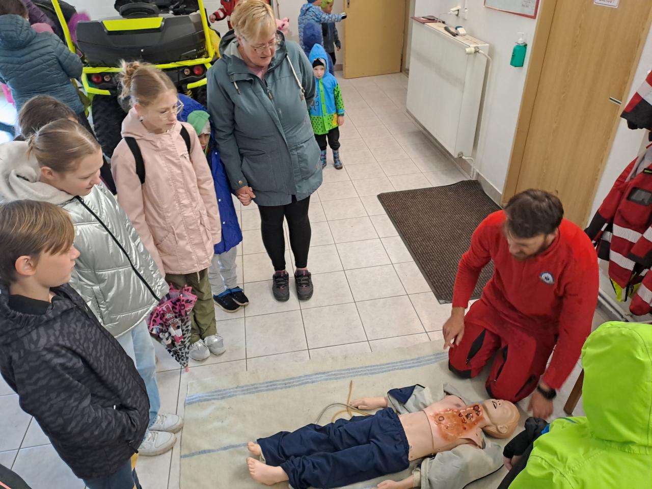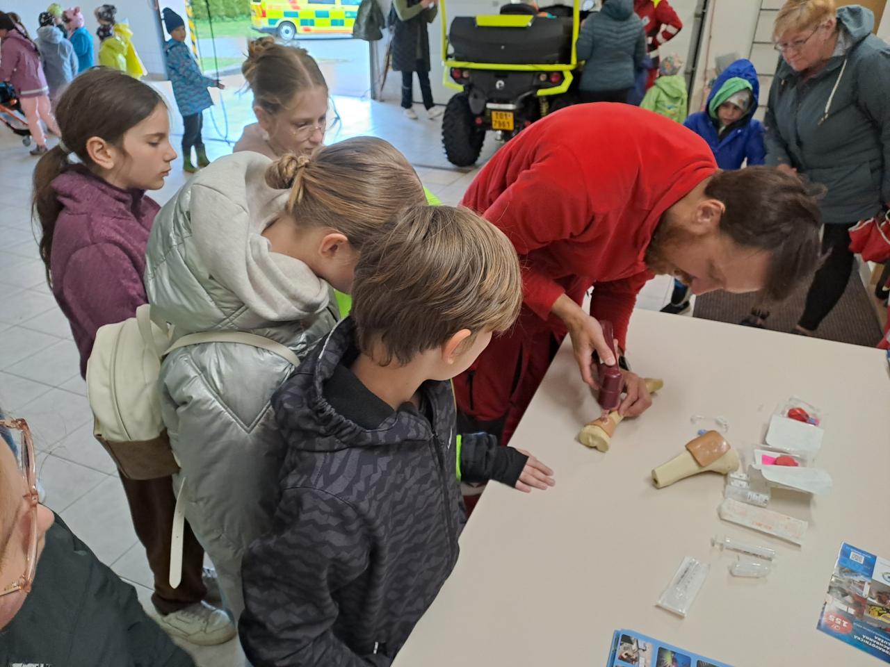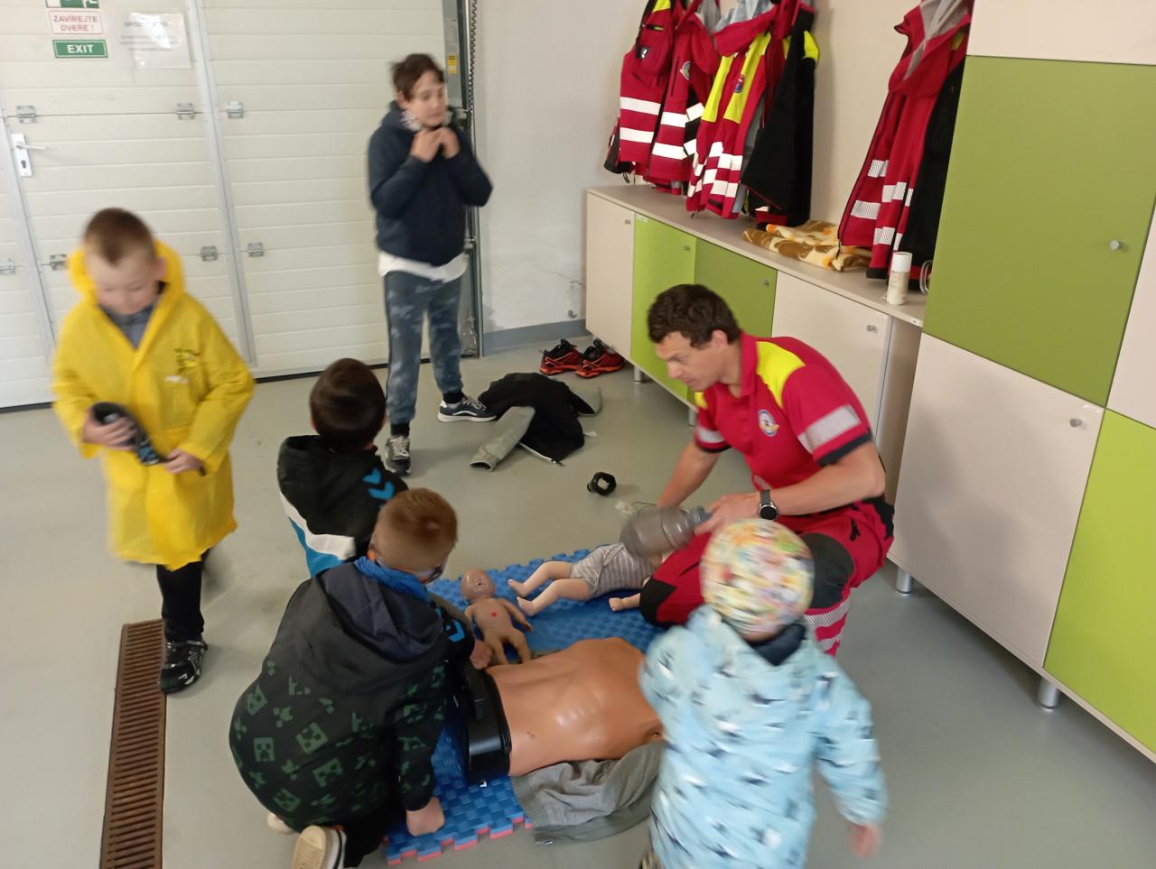 Byli jsme přivítáni šesti úžasnými záchranáři, kteří nás postupně provedli záchranným vozem, prozradili nám, jak vypadá porod nebo že jsou chvíle, kdy je potřeba aplikovat infuzi přímo do kostní dřeně. Děti si zopakovaly první pomoc a jako malí profíci prováděly srdeční masáž.